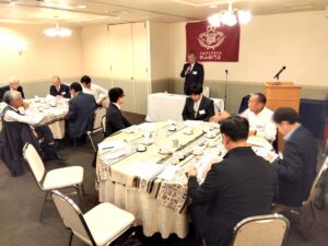講話の後は会食を兼ねた懇談が行われ、参加者による近況報告もありました。ゴルフ部からは六大学秋季コンペの結果報告が、ソフトボール部からは今週末18日(土)に予定されている練習試合についての案内がありました。また、事務局からは、25日(土)開催の会津稲門会100周年記念行事への参加について報告がありました。